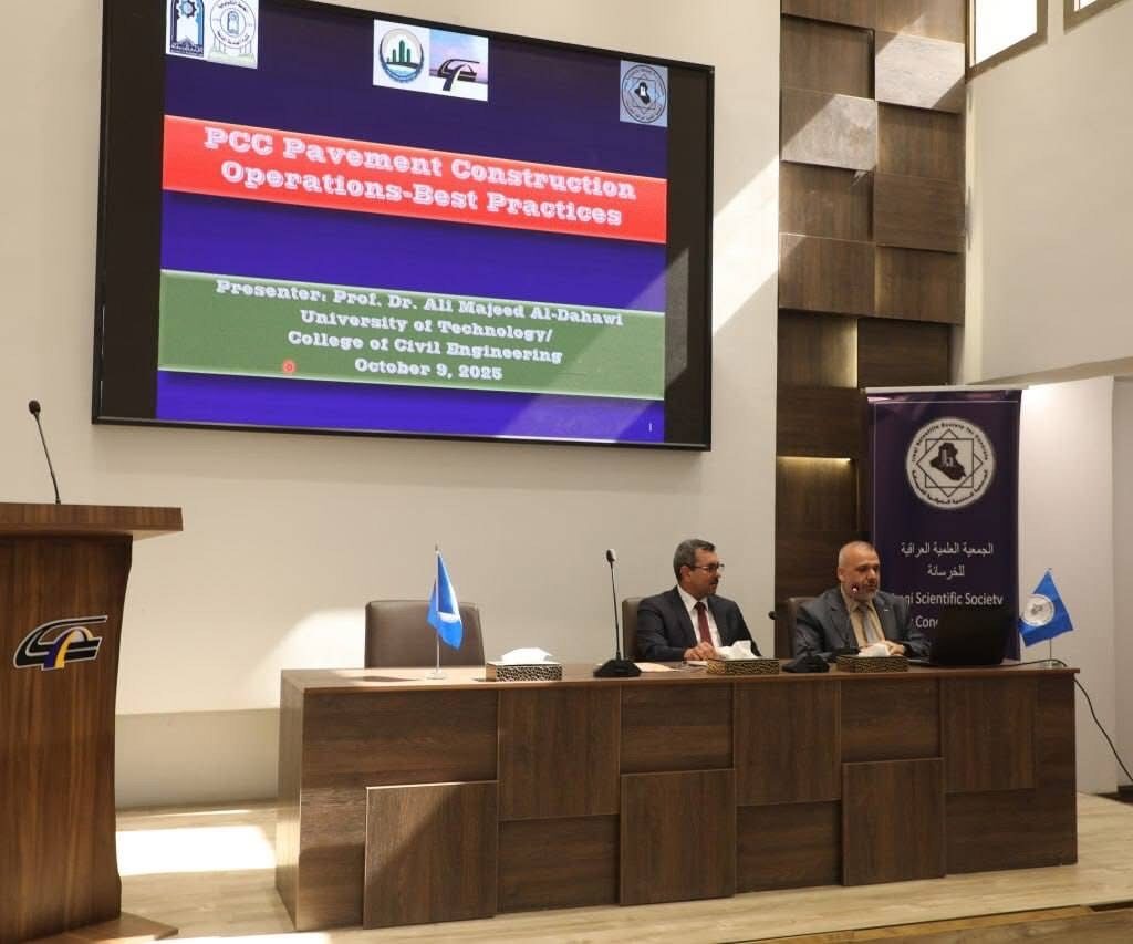 🟦 قدم محاضر الورشة الأستاذ الدكتور (علي مجيد خضير) عميد كلية الهندسة في الجامعة التكنولوجية، شرحا مفصلا عن اهم المشاكل التي ترافق اعمال انشاء التبليط الصلب ومتطلبات المواصفة الامريكية المعتمدة وحدودها وافضل الأساليب التي يتطلب اتباعها من المصمم او مهندسي المواقع او المقاول المنفذ لغرض تجاوزها.